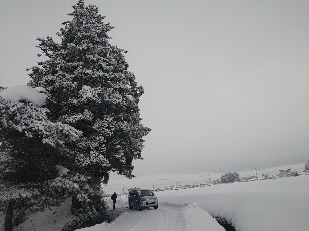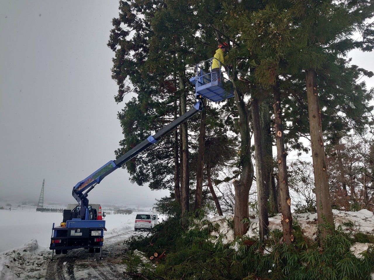 降り続く雪の重みで、枝に切れ目を入れるとすぐに枝が折れて落下するため、細心の注意を払って作業を行いました。