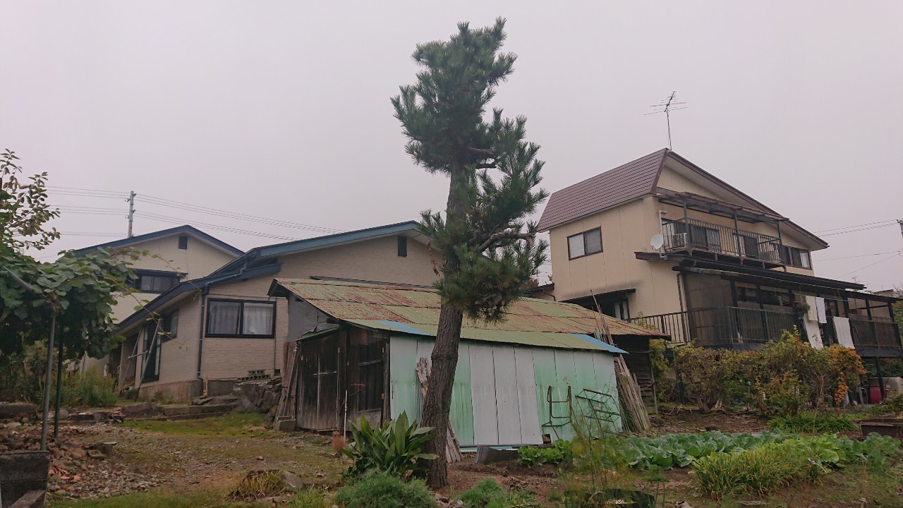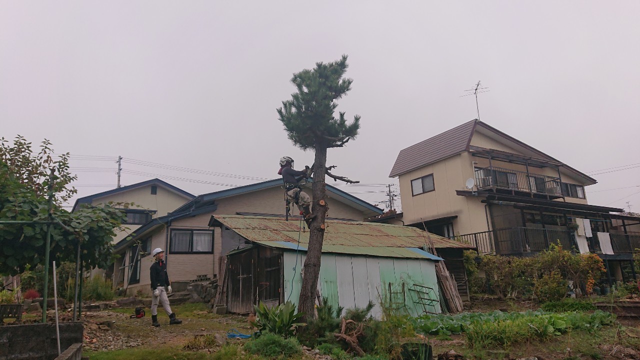 伐採木の周辺には建物や畑があり、お庭の地面を守るために吊るし切りを行いました。