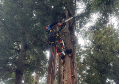 しかし、予想よりも早く風が強まったため、風が一時的に止むタイミングを見計らいながら、慎重に伐倒作業を行いました。